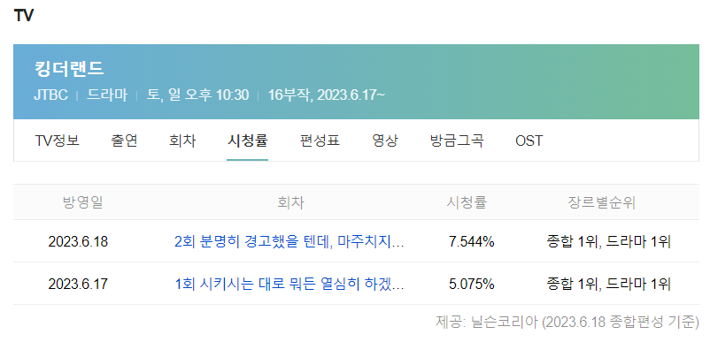 드라마 킹더랜드 시청률 : 1화 5.075%, 2화 7.544%