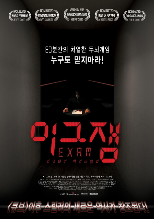 그렇게 경비원의 주머니에서 '라이터'를 발견하게 됩니다. 그래서 입사 희망자들은 이 '라이터'를 이용해서 스프링클러를 작동시켜서 시험지의 문제를 확인하자고 말합니다. 이런 기발한 생각도 잠시, 스프링클러를 작동시키려면 어떤 물체를 태워야만 했고, 이들은 탈락한 참가자의 시험지에 불을 질러 스프링클러를 작동시키기로 작정합니다. 하지만, '화이트'라는 별명을 가진 남성은, 탈락한 참가자의 시험지를 주는 척하면서 '브루넷' 참가자의 시험지를 주게 되고, 아무것도 몰랐던 '브루넷'은 자신의 시험지인 줄도 모르고 라이터에 불을 지펴 스프링클러가 작동하게 만드는 데에 성공하게 됩니다. 이후에 '브루넷'은, 자신의 시험지를 찾아보지만, 이미 불타서 없어져 있는 상황이었습니다. 결국 '브루넷'은 탈락하게 되고, 이런 행동을 한 '화이트'에게 왜 이런 일을 했냐고 물어봅니다. 하지만 '화이트'는 해야 할 일은 했다고 말하고, 화가 난 '블랙'은 "네 놈의 숨 통도 꺼주마!"라고 얘기하는데, 이때 전등이 꺼지게 됩니다. 알고 보니, 말하는 대로 전등이 작동되는 것이었습니다. 여러 일련의 사건이 벌어진 이후, '화이트'에 비열한 모습에 충격을 받은 한 참가자는 눈물을 흐느끼기 시작합니다. 그리고, 자신의 시험지를 찢어 이 시험을 포기하게 됩니다. 이때, 경비원의 과격적인 행동으로, 안경을 떨어뜨리고 밖으로 쫓겨나게 됩니다. 안에서 시험을 보는 사람들은, 점점 문제도 모르겠고, 어떤 답을 해야 될지 모르는 이 상황에서 '화이트'의 비열한 짓 때문에 다들 맘이 상하게 됩니다. 게다가 '화이트'는 경비원에 총까지 건드려서 사람들을 위협하려고 합니다. 하지만, 경비원의 총이 작동되지 않습니다. 알고 보니, 지문 인식으로 작동되는 총이었고, '화이트'는 경비원의 손을 빌려 지문인식에 성공한 뒤, 사람들에게 총을 겨두며 위협하기까지 합니다. 결국 '블랙'은 '화이트'로부터 총을 맞게 되고, 쓰러지게 됩니다. 과연 '화이트'는 이런 이기주의적 태도로 끝까지 살아남을 수 있을까요? 그리고 이 시험의 답은 진정 무엇일까요?