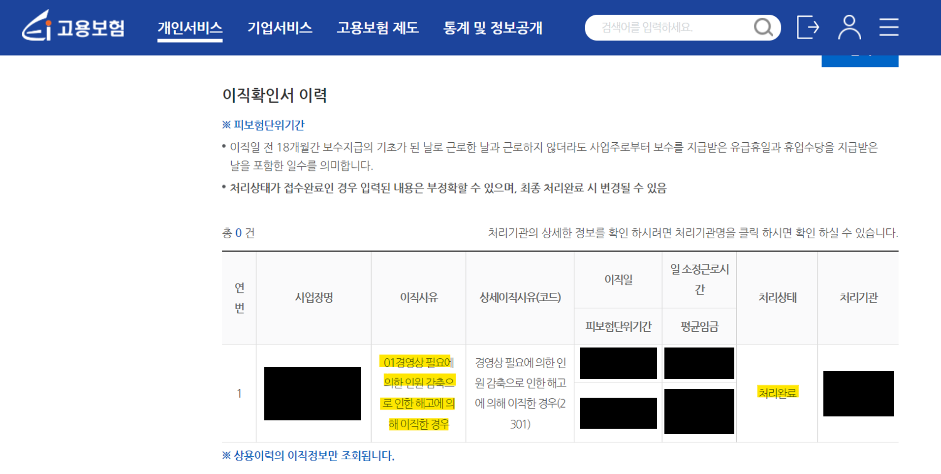 그럼 위에 화면처럼, 이직사유와 처리상태 여부를 확인해 보실 수 있습니다.